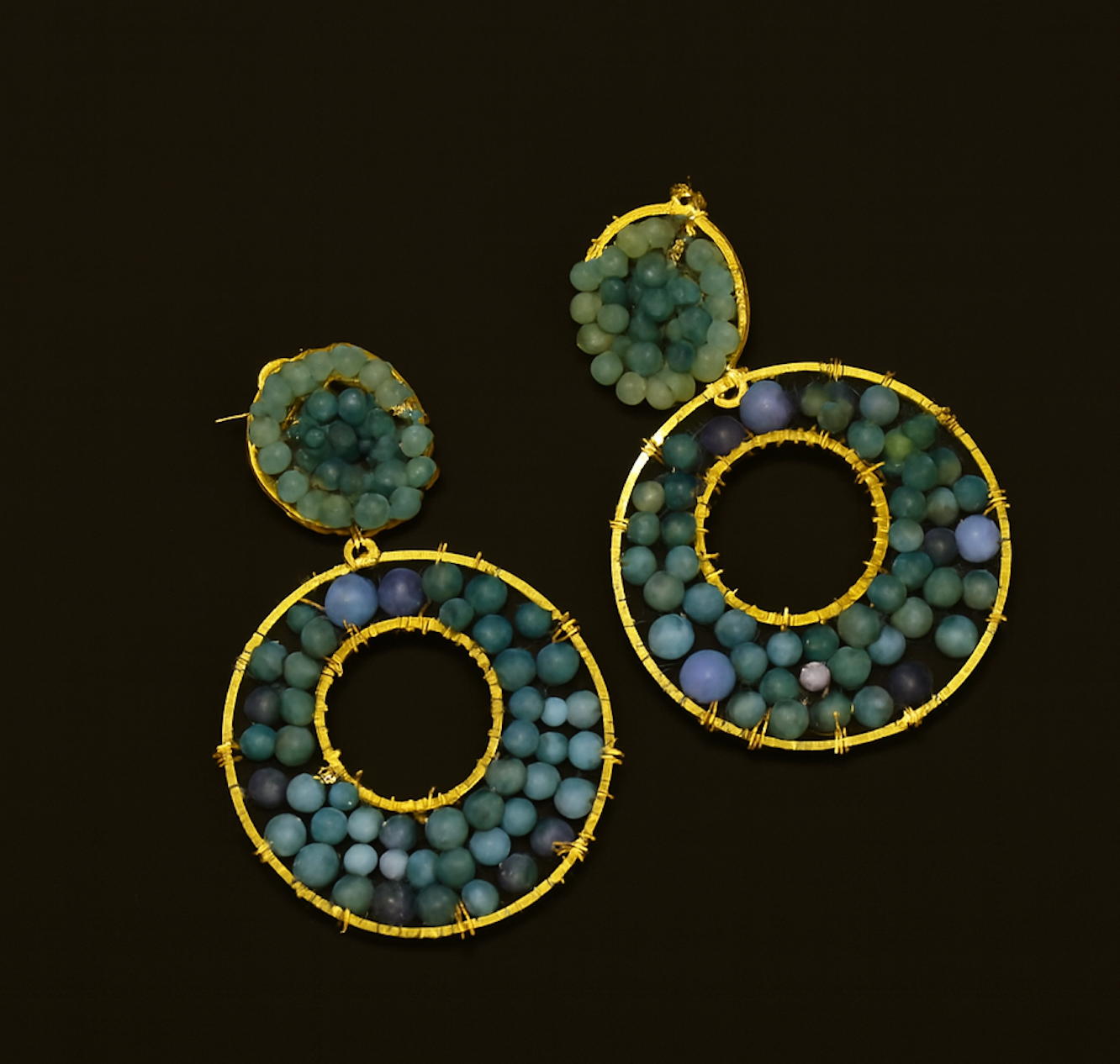 CL0011 Pendientes de doble aro con cuentas de colores turquesa y azul – Tejido en hilo dorado